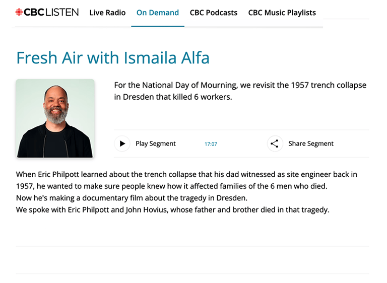 April 28, 2024: On our Day of Mourning, host Ismaila Alfa interviews Eric Philpott and John Hovius on the impact of this workplace tragedy.